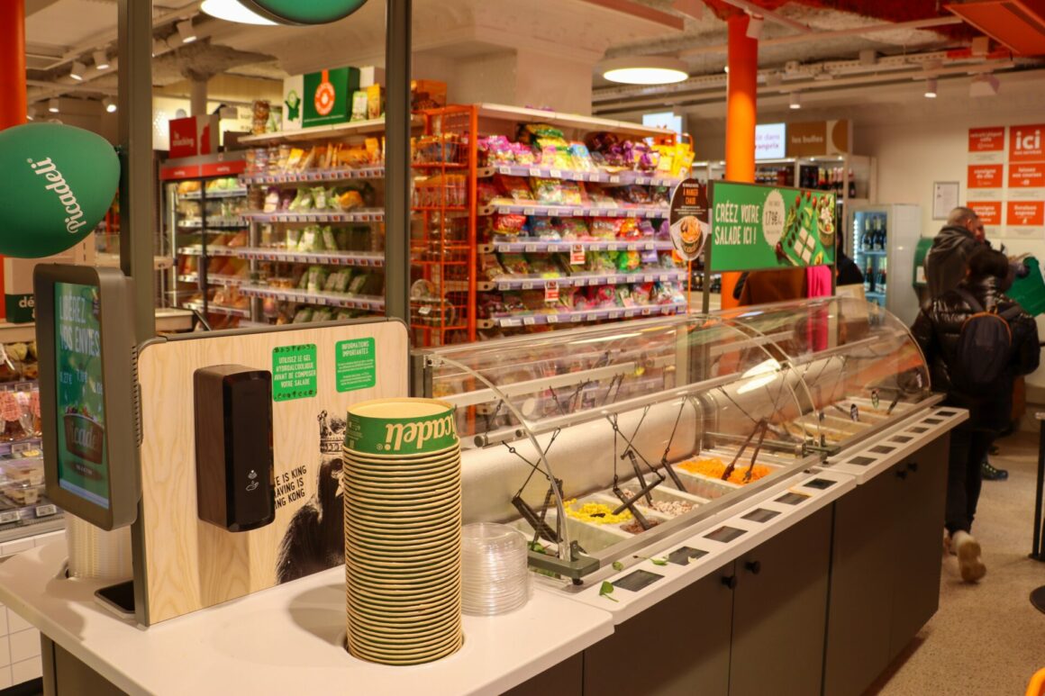 D’une surface de 430m², le magasin Franprix situé Place Victor Hugo à Paris, incarne pleinement le concept « Oxygène ». La restauration à emporter y joue un rôle clé. Le parcours client a été repensé avec une entrée dédiée aux offres repas et aux produits frais, et l’assortiment enrichi de plus de 900 références, notamment en restauration et en boulangerie-pâtisserie avec notamment un corner Krispy Kreme.